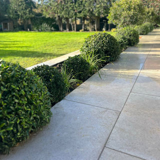 This garden transformation showcases how modern landscaping can blend crisp lines with year-round planting interest. A generous Egyptian limestone terrace extends seamlessly from the sliding glass doors, creating an elegant indoor–outdoor connection. The light, warm-toned Egyptian limestone paving delivers a clean, contemporary look while reflecting sunlight beautifully throughout the day.